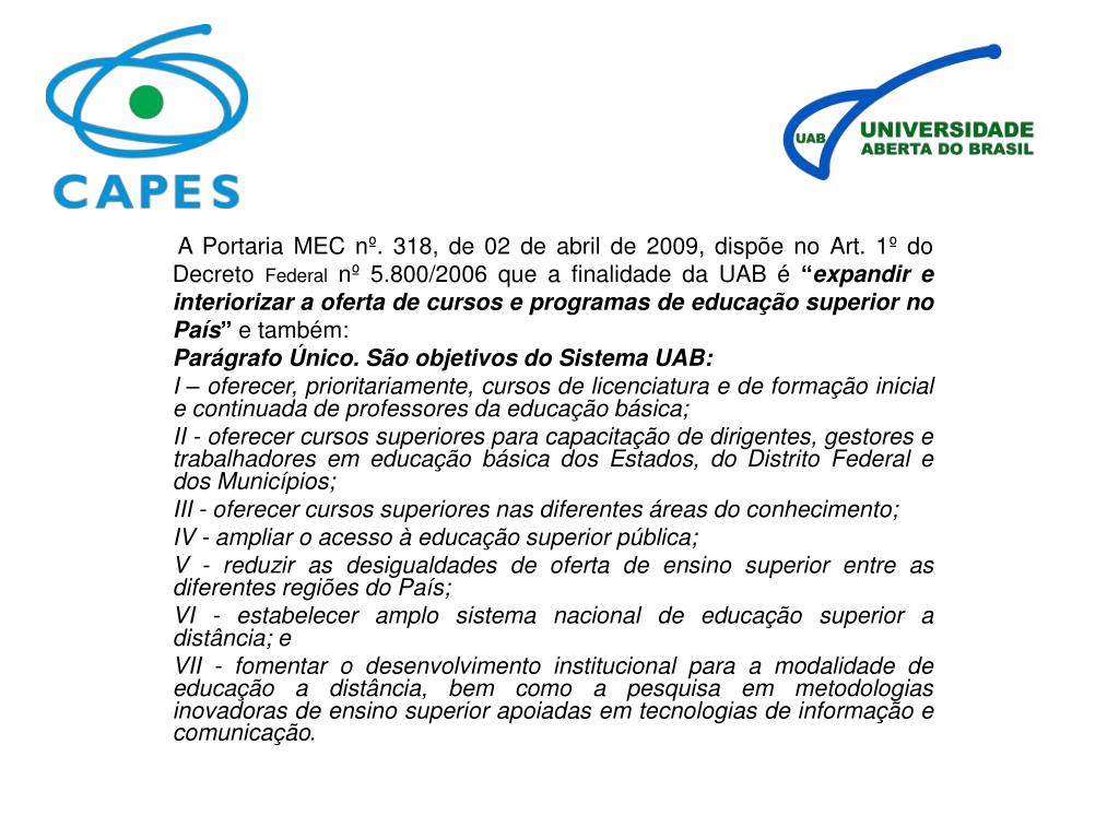 A Portaria MEC nº. 318, de 02 de abril de 2009, dispõe no Art. 1º do Decreto Federal nº 5.800/2006 que a finalidade da UAB é “expandir e interiorizar a oferta de cursos e programas de educação superior no País” e também: Parágrafo Único. São objetivos do Sistema UAB: I – oferecer, prioritariamente, cursos de licenciatura e de formação inicial e continuada de professores da educação básica; II - oferecer cursos superiores para capacitação de dirigentes, gestores e trabalhadores em educação básica dos Estados, do Distrito Federal e dos Municípios; III - oferecer cursos superiores nas diferentes áreas do conhecimento; IV - ampliar o acesso à educação superior pública; V - reduzir as desigualdades de oferta de ensino superior entre as diferentes regiões do País; VI - estabelecer amplo sistema nacional de educação superior a distância; e VII - fomentar o desenvolvimento institucional para a modalidade de educação a distância, bem como a pesquisa em metodologias inovadoras de ensino superior apoiadas em tecnologias de informação e comunicação.