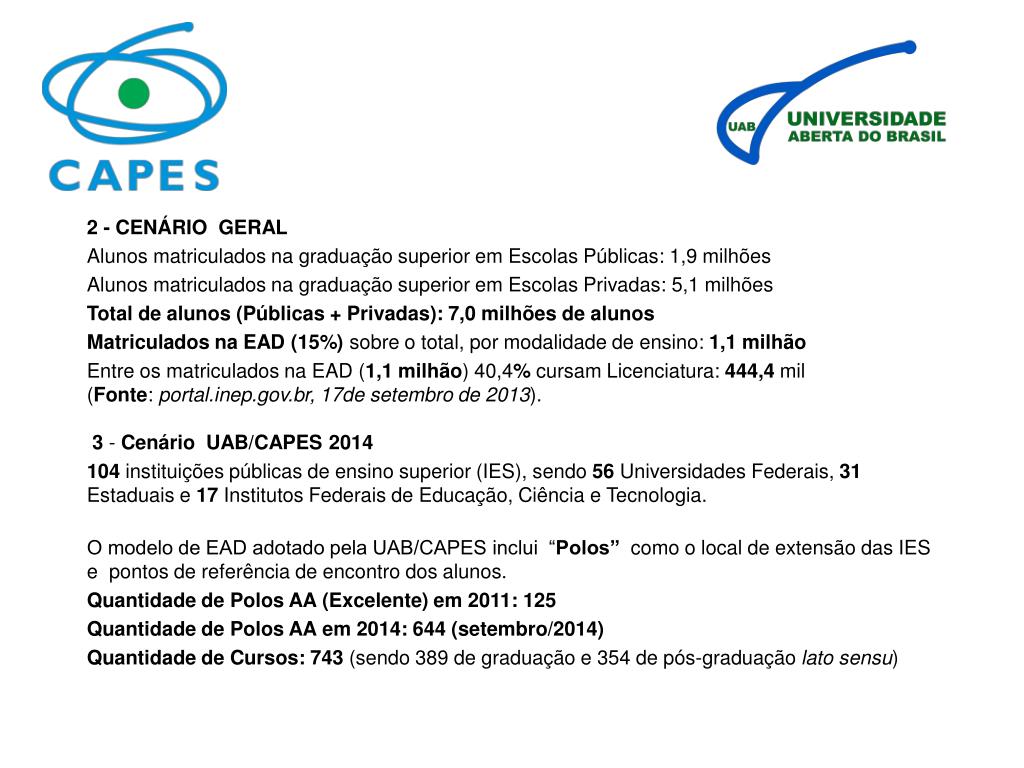 2 - CENÁRIO GERAL Alunos matriculados na graduação superior em Escolas Públicas: 1,9 milhões Alunos matriculados na graduação superior em Escolas Privadas: 5,1 milhões Total de alunos (Públicas + Privadas): 7,0 milhões de alunos Matriculados na EAD (15%)sobre o total, por modalidade de ensino: 1,1 milhão Entre os matriculados na EAD (1,1 milhão) 40,4% cursam Licenciatura: 444,4 mil (Fonte: portal.inep.gov.br, 17de setembro de 2013). 3 - Cenário UAB/CAPES 2014 104 instituições públicas de ensino superior (IES), sendo 56 Universidades Federais, 31 Estaduais e 17 Institutos Federais de Educação, Ciência e Tecnologia. O modelo de EAD adotado pela UAB/CAPES inclui “Polos” como o local de extensão das IES e pontos de referência de encontro dos alunos. Quantidade de Polos AA (Excelente) em 2011: 125 Quantidade de Polos AA em 2014: 644 (setembro/2014) Quantidade de Cursos: 743 (sendo 389 de graduaçãoe 354 depós-graduação latosensu)