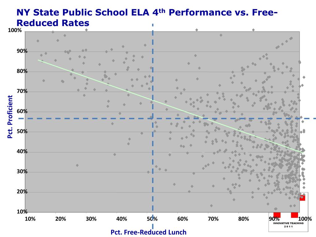 NY State Public School ELA 4th Performance vs. Free-Reduced Rates 100% 90% 80% 70% Pct. Proficient 60% 50% 40% 30% 20% 10% 10% 20% 30% 40% 50% 60% 70% 80% 90% 100% Pct. Free-Reduced Lunch