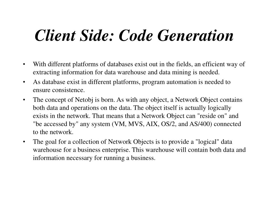 Client Side: Code Generation • With different platforms of databases exist out in the fields, an efficient way of extracting information for data warehouse and data mining is needed. • As database exist in different platforms, program automation is needed to ensure consistence. • The concept of Netobj is born. As with any object, a Network Object contains both data and operations on the data. The object itself is actually logically exists in the network. That means that a Network Object can "reside on" and "be accessed by" any system (VM, MVS, AIX, OS/2, and AS/400) connected to the network. • The goal for a collection of Network Objects is to provide a "logical" data warehouse for a business enterprise. This warehouse will contain both data and information necessary for running a business.