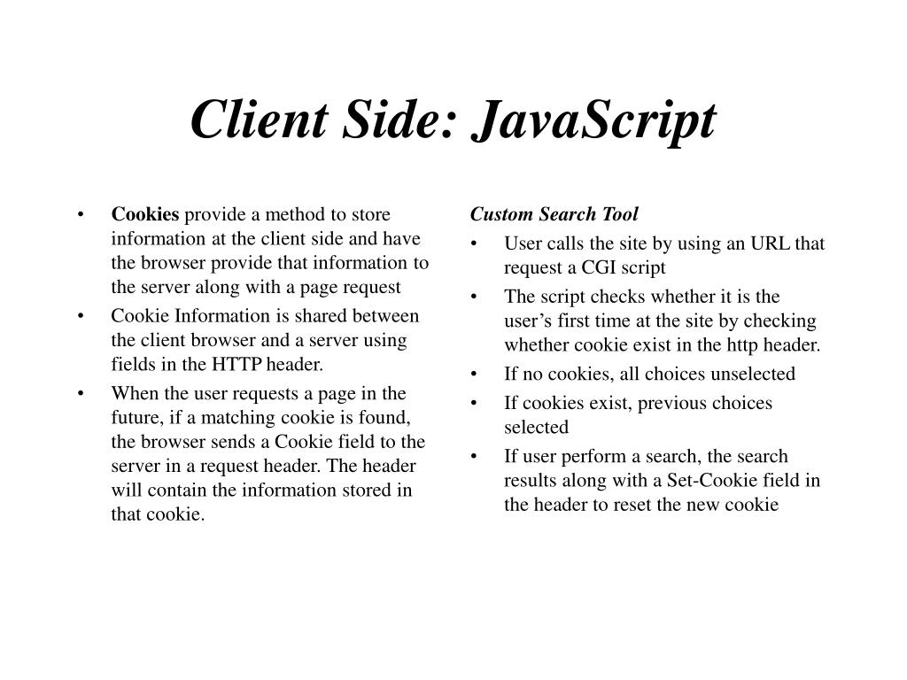 Cookies provide a method to store information at the client side and have the browser provide that information to the server along with a page request Cookie Information is shared between the client browser and a server using fields in the HTTP header. When the user requests a page in the future, if a matching cookie is found, the browser sends a Cookie field to the server in a request header. The header will contain the information stored in that cookie. Custom Search Tool User calls the site by using an URL that request a CGI script The script checks whether it is the user’s first time at the site by checking whether cookie exist in the http header. If no cookies, all choices unselected If cookies exist, previous choices selected If user perform a search, the search results along with a Set-Cookie field in the header to reset the new cookie Client Side: JavaScript