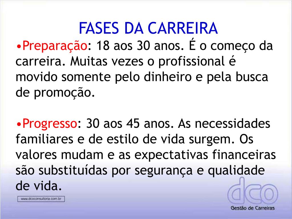 FASES DA CARREIRA • Preparação: 18 aos 30 anos. É o começo da carreira. Muitas vezes o profissional é movido somente pelo dinheiro e pela busca de promoção. • Progresso: 30 aos 45 anos. As necessidades familiares e de estilo de vida surgem. Os valores mudam e as expectativas financeiras são substituídas por segurança e qualidade de vida.