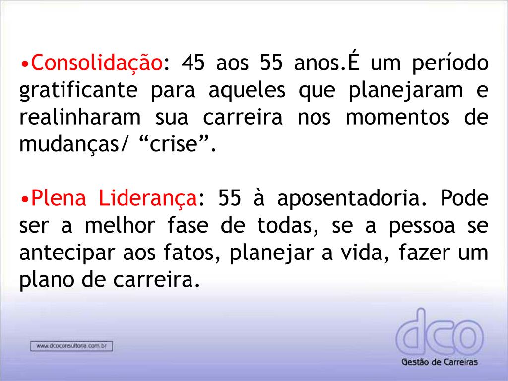 Consolidação: 45 aos 55 anos.É um período gratificante para aqueles que planejaram e realinharam sua carreira nos momentos de mudanças/ “crise”. • Plena Liderança: 55 à aposentadoria. Pode ser a melhor fase de todas, se a pessoa se antecipar aos fatos, planejar a vida, fazer um plano de carreira.