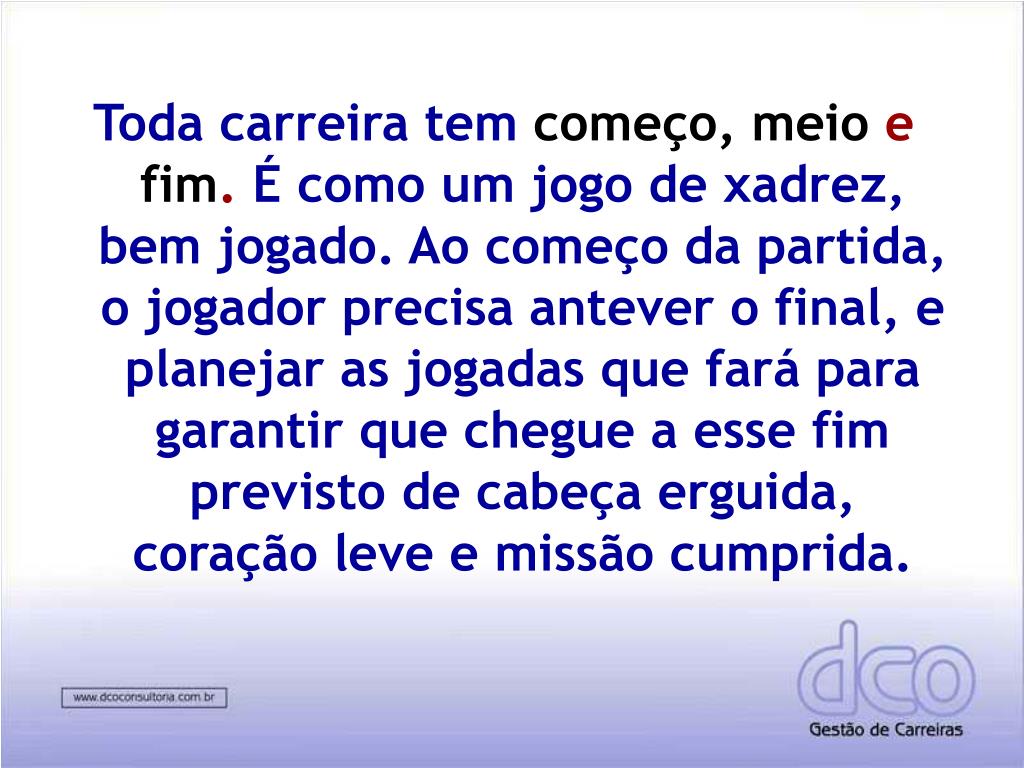 Toda carreira temcomeço,meio e fim. É como um jogo de xadrez, bem jogado. Ao começo da partida, o jogador precisa antever o final, e planejar as jogadas que fará para garantir que chegue a esse fim previsto de cabeça erguida, coração leve e missão cumprida.