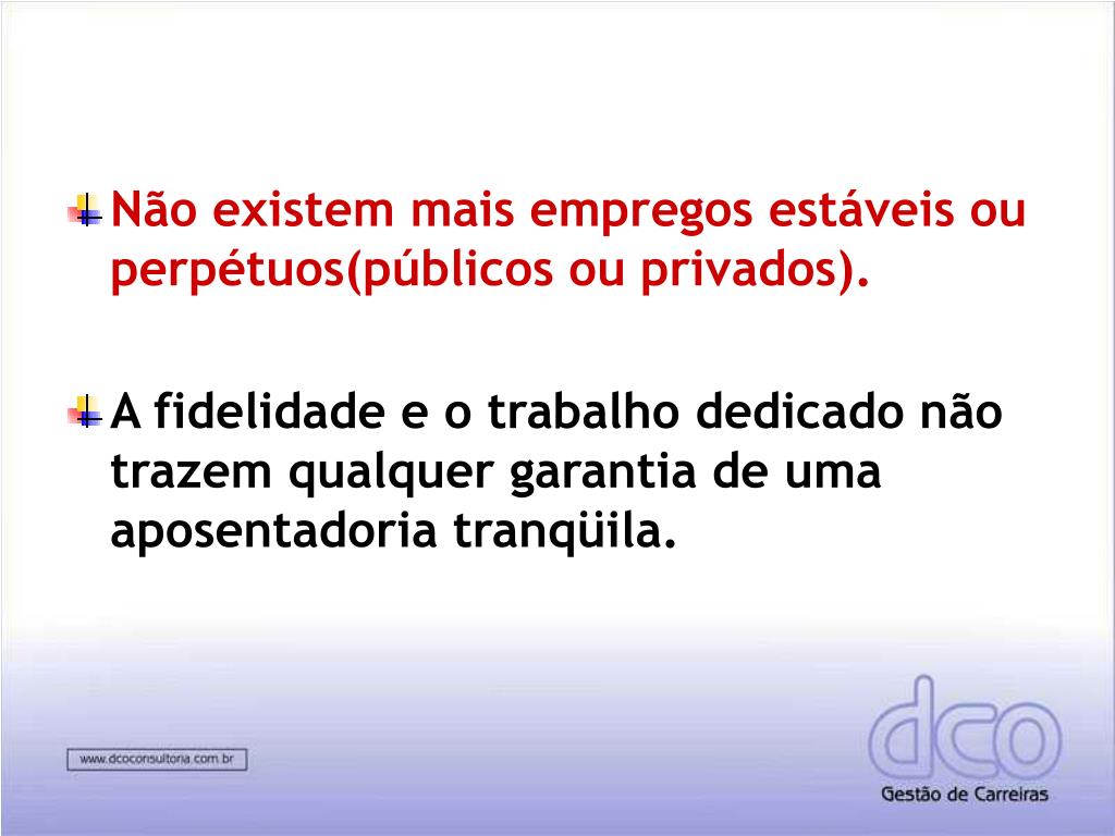 Não existem mais empregos estáveis ou perpétuos(públicos ou privados). • A fidelidade e o trabalho dedicado não trazem qualquer garantia de uma aposentadoria tranqüila.