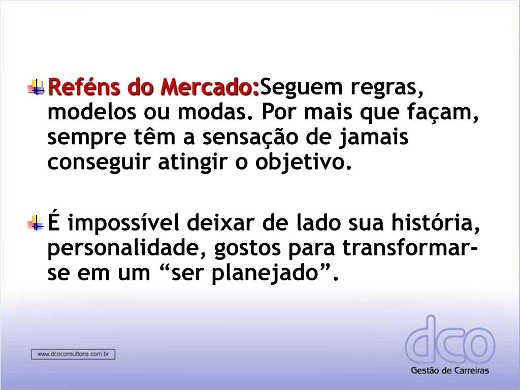 Reféns do Mercado:Seguem regras, modelos ou modas. Por mais que façam, sempre têm a sensação de jamais conseguir atingir o objetivo. • É impossível deixar de lado sua história, personalidade, gostos para transformar-se em um “ser planejado”.
