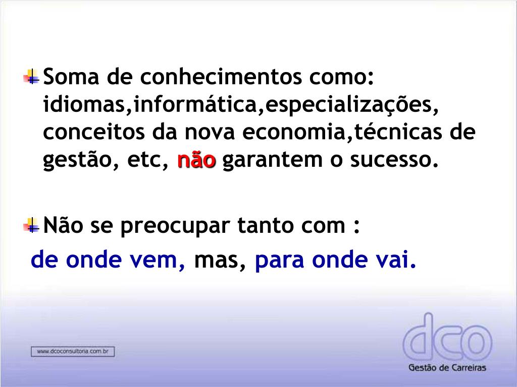 Soma de conhecimentos como: idiomas,informática,especializações, conceitos da nova economia,técnicas de gestão, etc, não garantem o sucesso. • Não se preocupar tanto com : • de onde vem,mas,para onde vai.