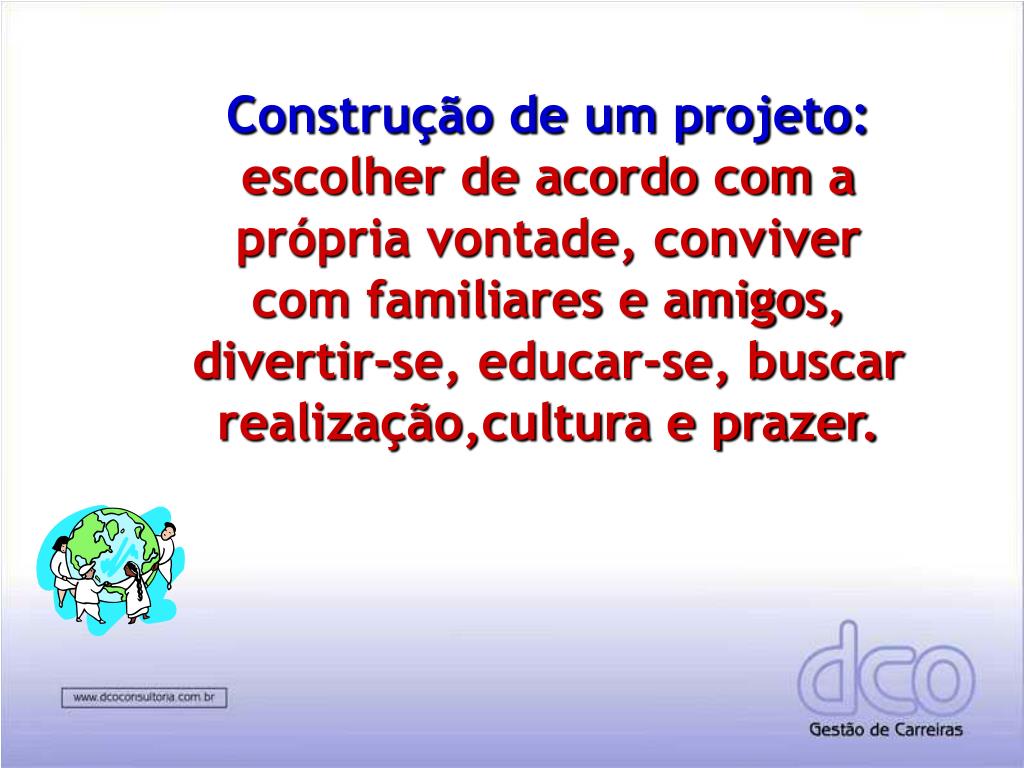 Construção de um projeto: escolher de acordo com a própria vontade, conviver com familiares e amigos, divertir-se, educar-se, buscar realização,cultura e prazer.