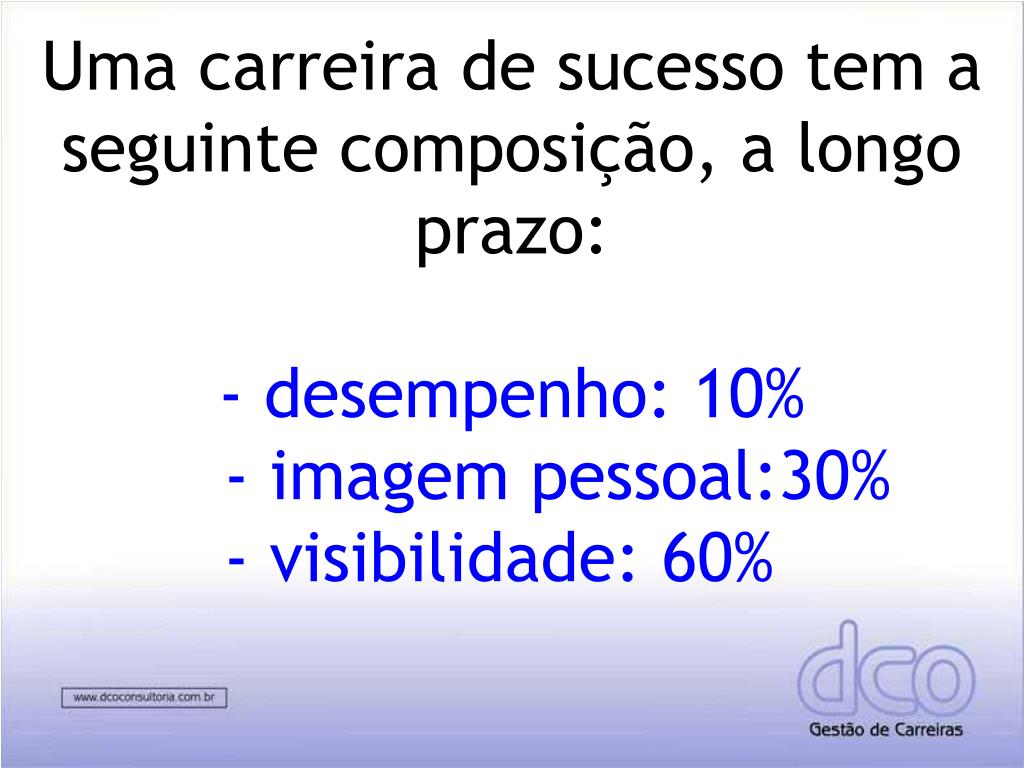 Uma carreira de sucesso tem a seguinte composição, a longo prazo: - desempenho: 10% - imagem pessoal:30% - visibilidade: 60%