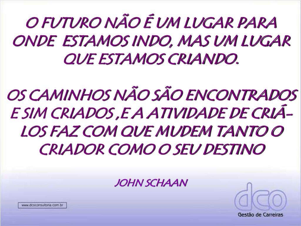 O FUTURO NÃO É UM LUGAR PARA ONDE ESTAMOS INDO, MAS UM LUGAR QUE ESTAMOS CRIANDO.OS CAMINHOS NÃO SÃO ENCONTRADOS E SIM CRIADOS ,E A ATIVIDADE DE CRIÁ-LOS FAZ COM QUE MUDEM TANTO O CRIADOR COMO O SEU DESTINOJOHN SCHAAN