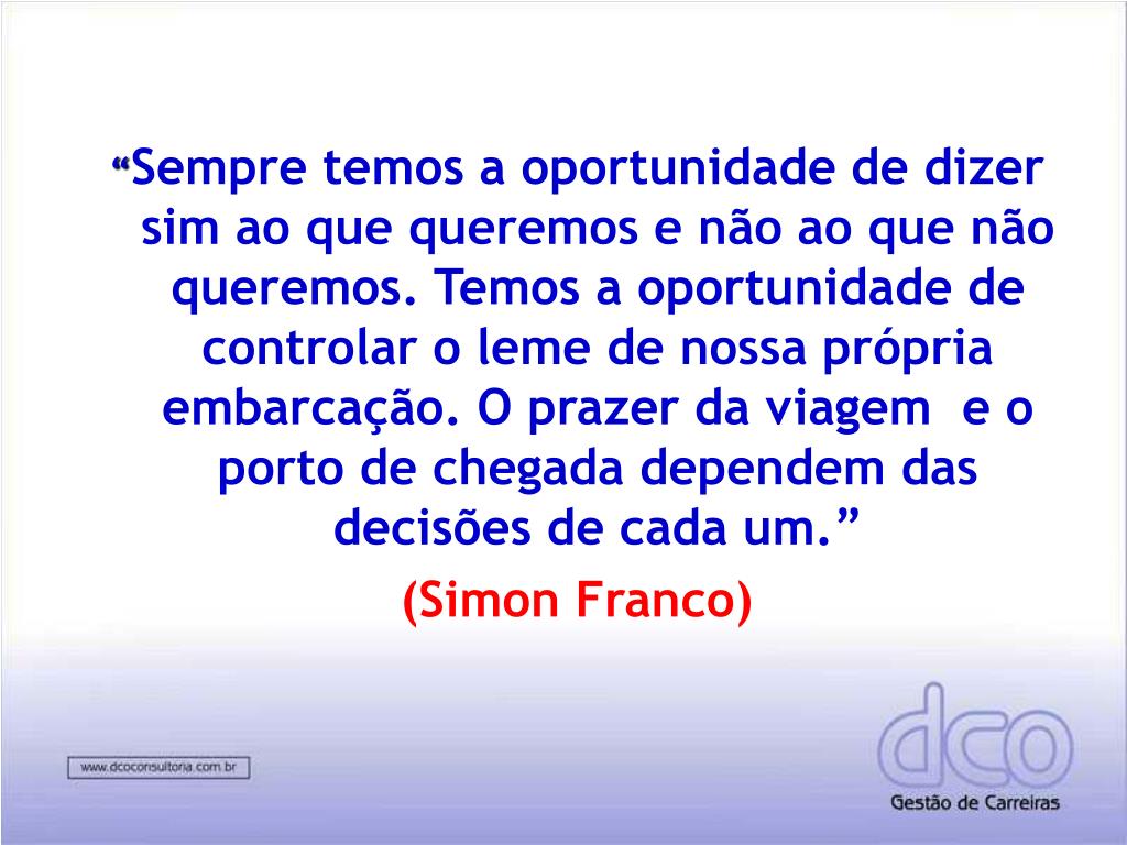 “Sempre temos a oportunidade de dizer sim ao que queremos e não ao que não queremos. Temos a oportunidade de controlar o leme de nossa própria embarcação. O prazer da viagem e o porto de chegada dependem das decisões de cada um.” • (Simon Franco)