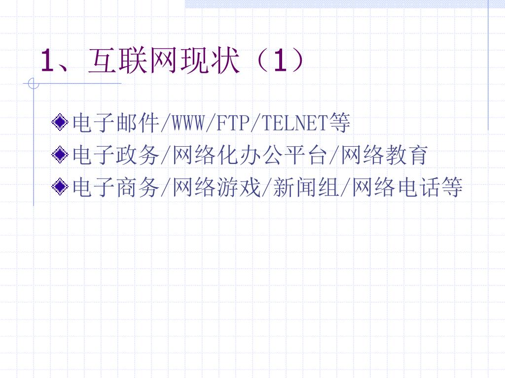 1、互联网现状(1) • 电子邮件/WWW/FTP/TELNET等 • 电子政务/网络化办公平台/网络教育 • 电子商务/网络游戏/新闻组/网络电话等
