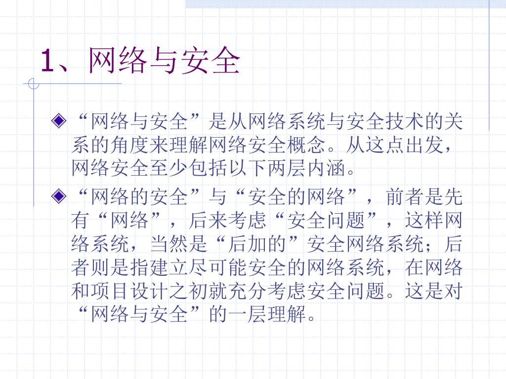 1、网络与安全 • “网络与安全”是从网络系统与安全技术的关系的角度来理解网络安全概念。从这点出发,网络安全至少包括以下两层内涵。 • “网络的安全”与“安全的网络”,前者是先有“网络”,后来考虑“安全问题”,这样网络系统,当然是“后加的”安全网络系统;后者则是指建立尽可能安全的网络系统,在网络和项目设计之初就充分考虑安全问题。这是对“网络与安全”的一层理解。