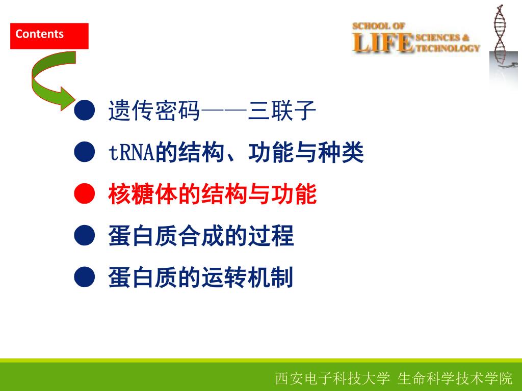 ● 遗传密码——三联子 ● tRNA的结构、功能与种类 ● 核糖体的结构与功能 ● 蛋白质合成的过程 ● 蛋白质的运转机制 Contents
