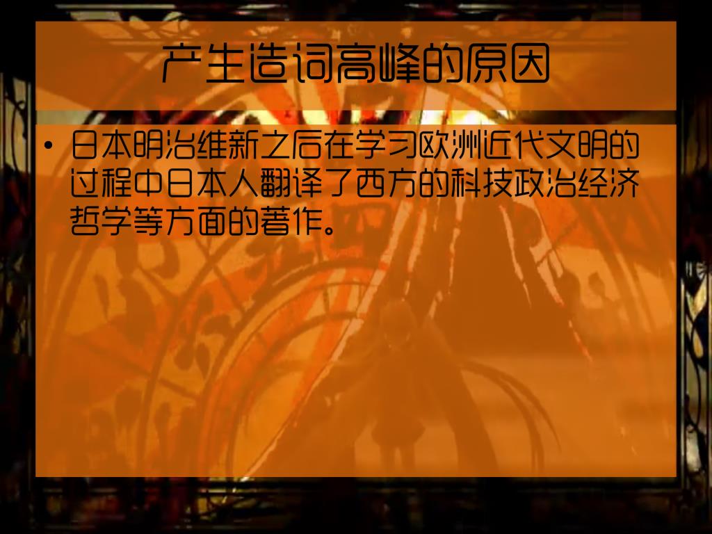 产生造词高峰的原因 • 日本明治维新之后在学习欧洲近代文明的过程中日本人翻译了西方的科技政治经济哲学等方面的著作。