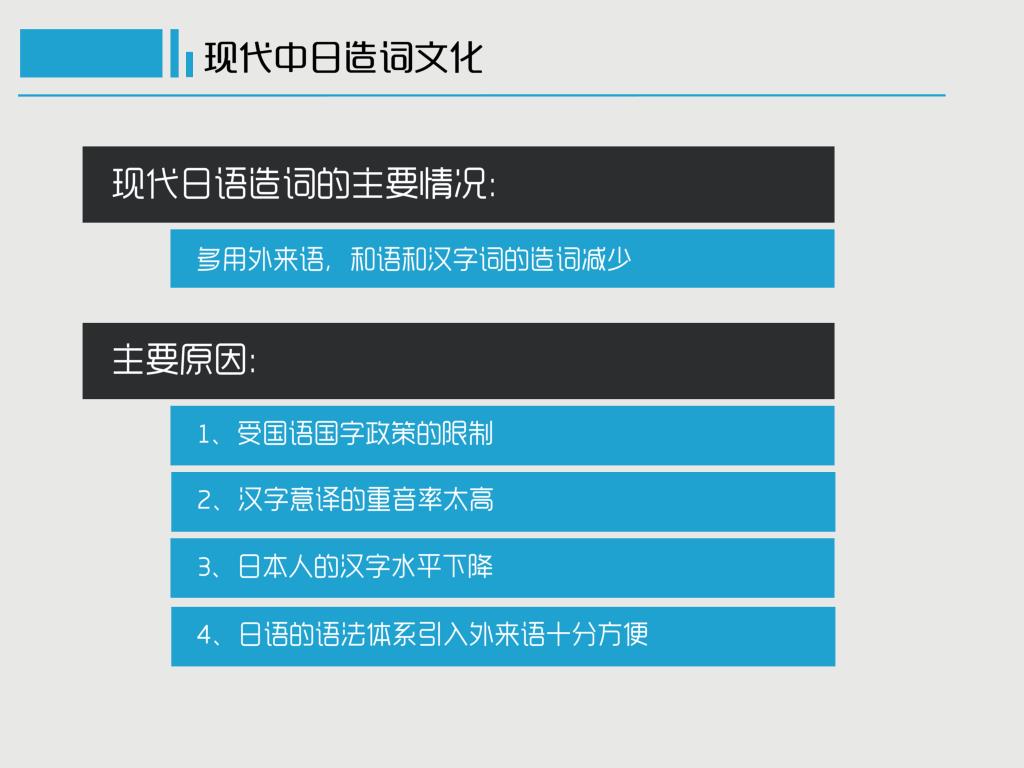 现代中日造词文化 现代日语造词的主要情况: 多用外来语,和语和汉字词的造词减少 主要原因: 1、受国语国字政策的限制 2、汉字意译的重音率太高 3、日本人的汉字水平下降 4、日语的语法体系引入外来语十分方便