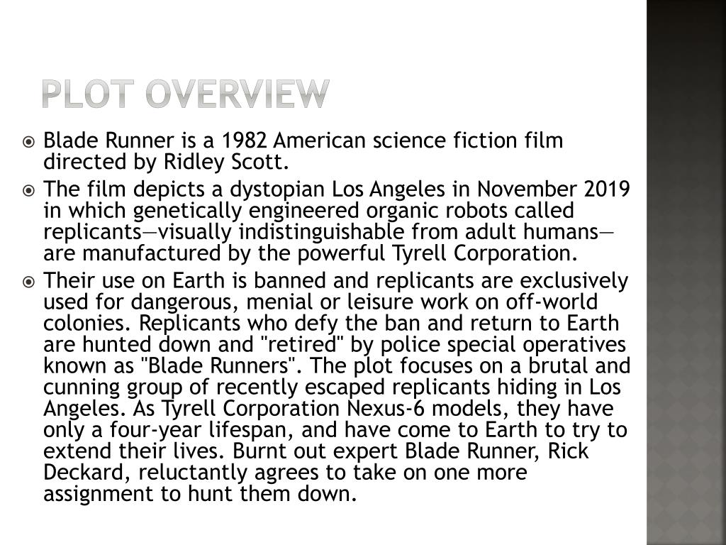PLOT OVERVIEW • Blade Runner is a 1982 American science fiction film directed by Ridley Scott. • The film depicts a dystopian Los Angeles in November 2019 in which genetically engineered organic robots called replicants—visually indistinguishable from adult humans—are manufactured by the powerful Tyrell Corporation. • Their use on Earth is banned and replicants are exclusively used for dangerous, menial or leisure work on off-world colonies. Replicants who defy the ban and return to Earth are hunted down and "retired" by police special operatives known as "Blade Runners". The plot focuses on a brutal and cunning group of recently escaped replicants hiding in Los Angeles. As Tyrell Corporation Nexus-6 models, they have only a four-year lifespan, and have come to Earth to try to extend their lives. Burnt out expert Blade Runner, Rick Deckard, reluctantly agrees to take on one more assignment to hunt them down.