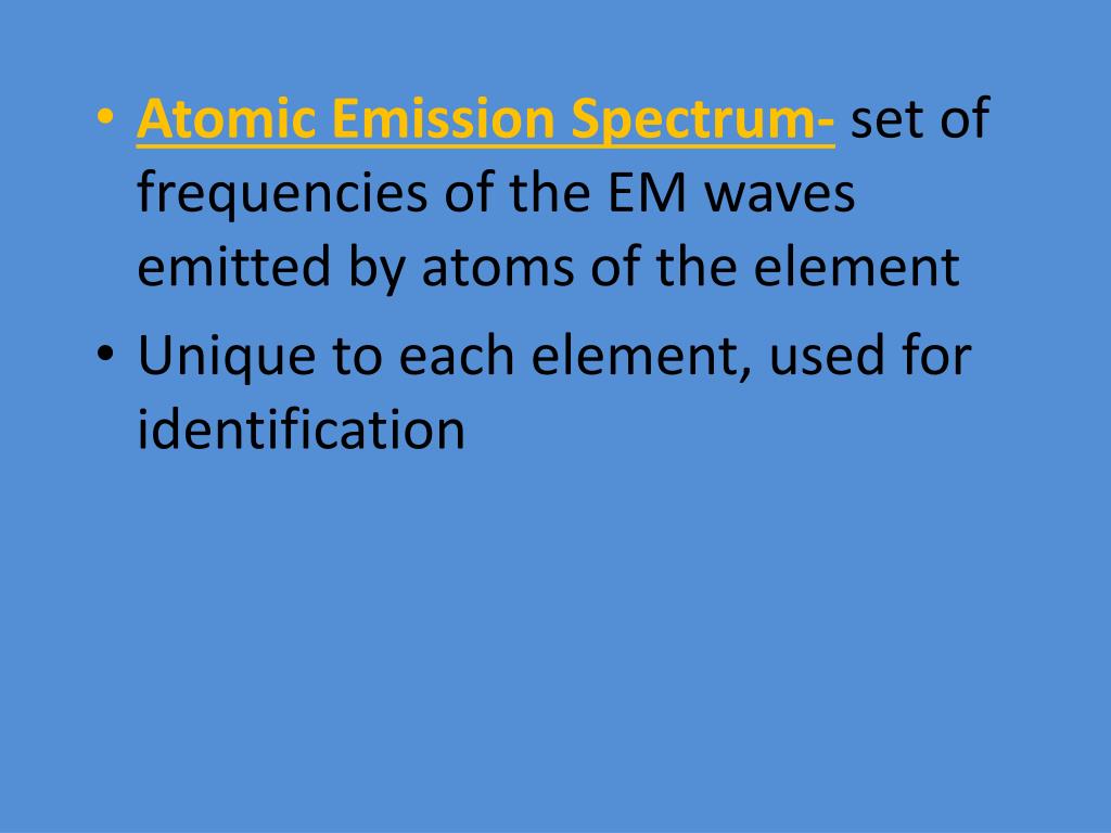 Atomic Emission Spectrum-set of frequencies of the EM waves emitted by atoms of the element • Unique to each element, used for identification