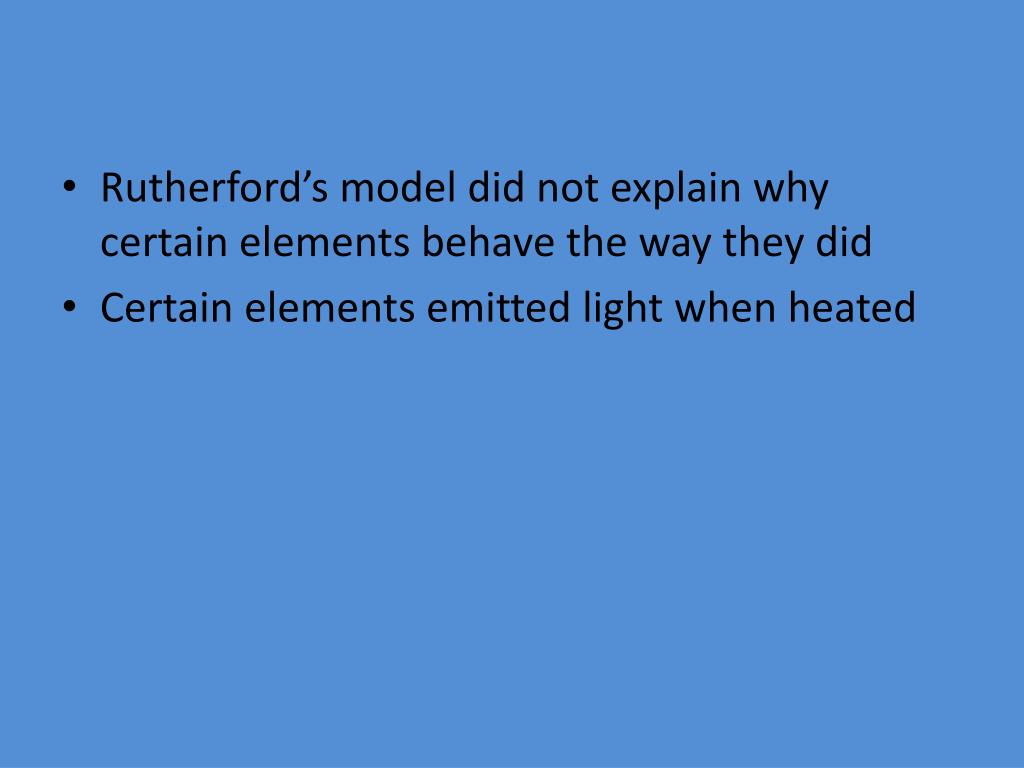 Rutherford’s model did not explain why certain elements behave the way they did • Certain elements emitted light when heated