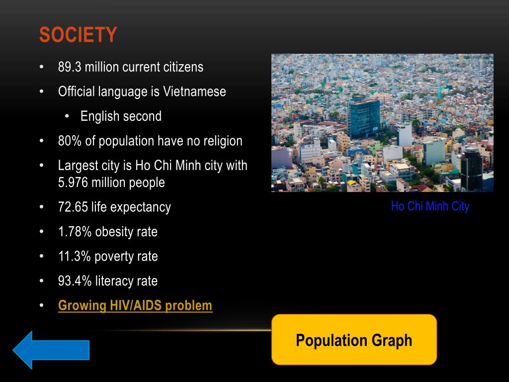 Society • 89.3 million current citizens • Official language is Vietnamese • English second • 80% of population have no religion • Largest city is Ho Chi Minh city with 5.976 million people • 72.65 life expectancy • 1.78% obesity rate • 11.3% poverty rate • 93.4% literacy rate • Growing HIV/AIDS problem Ho Chi Minh City Population Graph