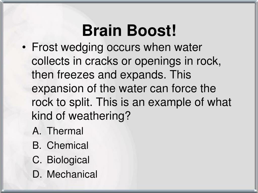 Brain Boost! • Frost wedging occurs when water collects in cracks or openings in rock, then freezes and expands. This expansion of the water can force the rock to split. This is an example of what kind of weathering? • Thermal • Chemical • Biological • Mechanical