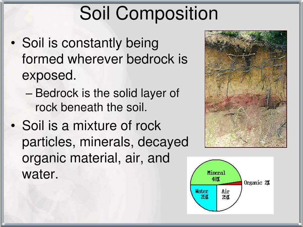 Soil Composition • Soil is constantly being formed wherever bedrock is exposed. • Bedrock is the solid layer of rock beneath the soil. • Soil is a mixture of rock particles, minerals, decayed organic material, air, and water.