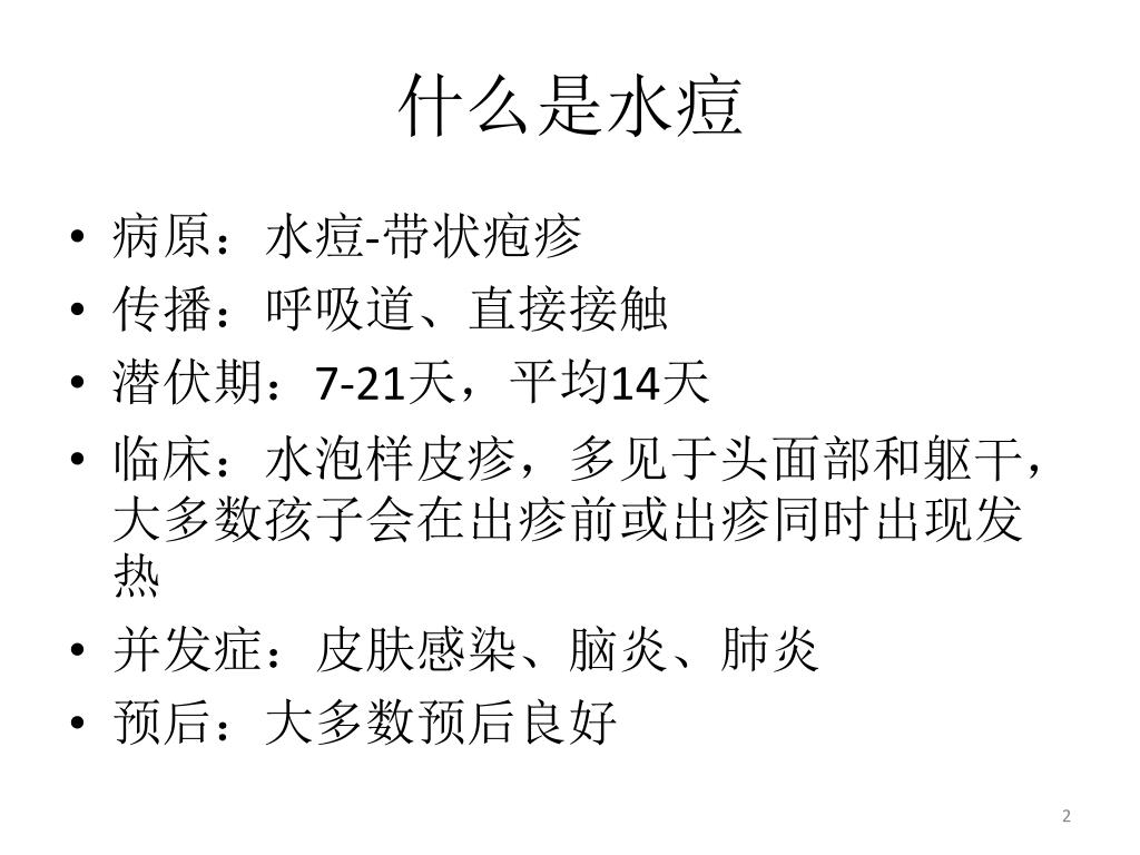 水痘. 什么是水痘. 病原:水痘 - 带状疱疹 传播:呼吸道、直接接触 潜伏期: 7-21 天,平均 14 天 临床:水泡样皮疹,多见于头面部和躯干,大多数孩子会在出疹前或出疹同时出现发热 并发症:皮肤感染、脑炎、肺炎 预后:大多数预后良好. 学校管理中会遇到的问题 1. 怎么一下子就这么多小伙伴病了???. 其实只有一个原因水痘在 潜伏期也会传染!!!. 很多疾病都会在潜伏期传染 为什么水痘一出现就会形成爆发或突发呢?. 两个原因. 潜伏期长 管理不到位 晨午检落实不到位 不会早期识别 日常性防控措施落实不到家. 幼儿园管理中会遇到的问题 2.