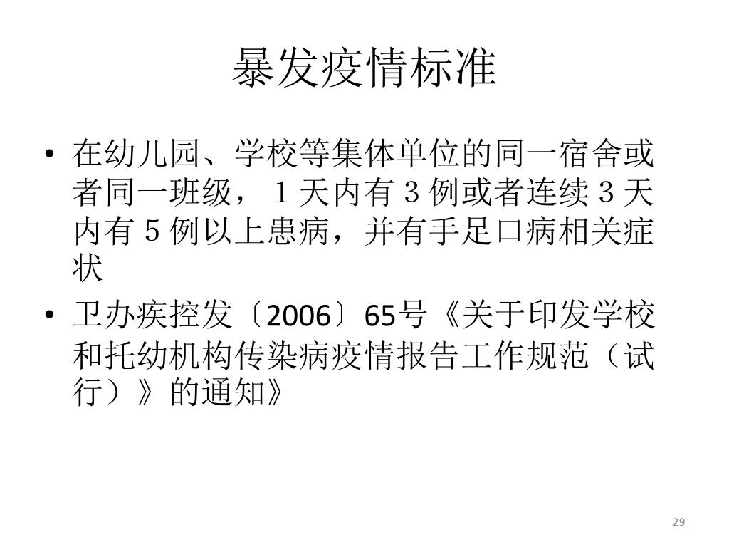 暴发疫情标准 • 在幼儿园、学校等集体单位的同一宿舍或者同一班级,1天内有3例或者连续3天内有5例以上患病,并有手足口病相关症状 • 卫办疾控发〔2006〕65号《关于印发学校和托幼机构传染病疫情报告工作规范(试行)》的通知》