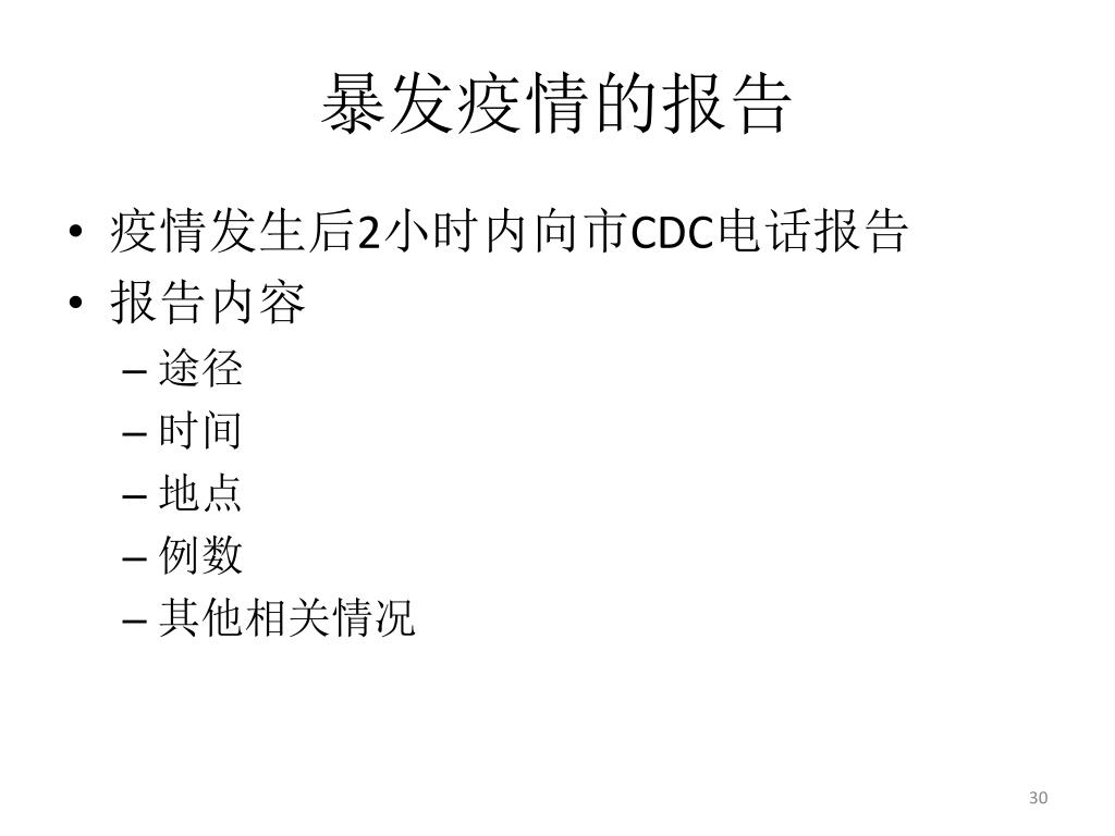 暴发疫情的报告 • 疫情发生后2小时内向市CDC电话报告 • 报告内容 • 途径 • 时间 • 地点 • 例数 • 其他相关情况