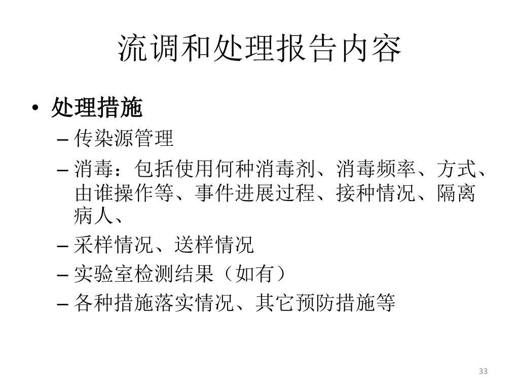 流调和处理报告内容 • 处理措施 • 传染源管理 • 消毒:包括使用何种消毒剂、消毒频率、方式、由谁操作等、事件进展过程、接种情况、隔离病人、 • 采样情况、送样情况 • 实验室检测结果(如有) • 各种措施落实情况、其它预防措施等