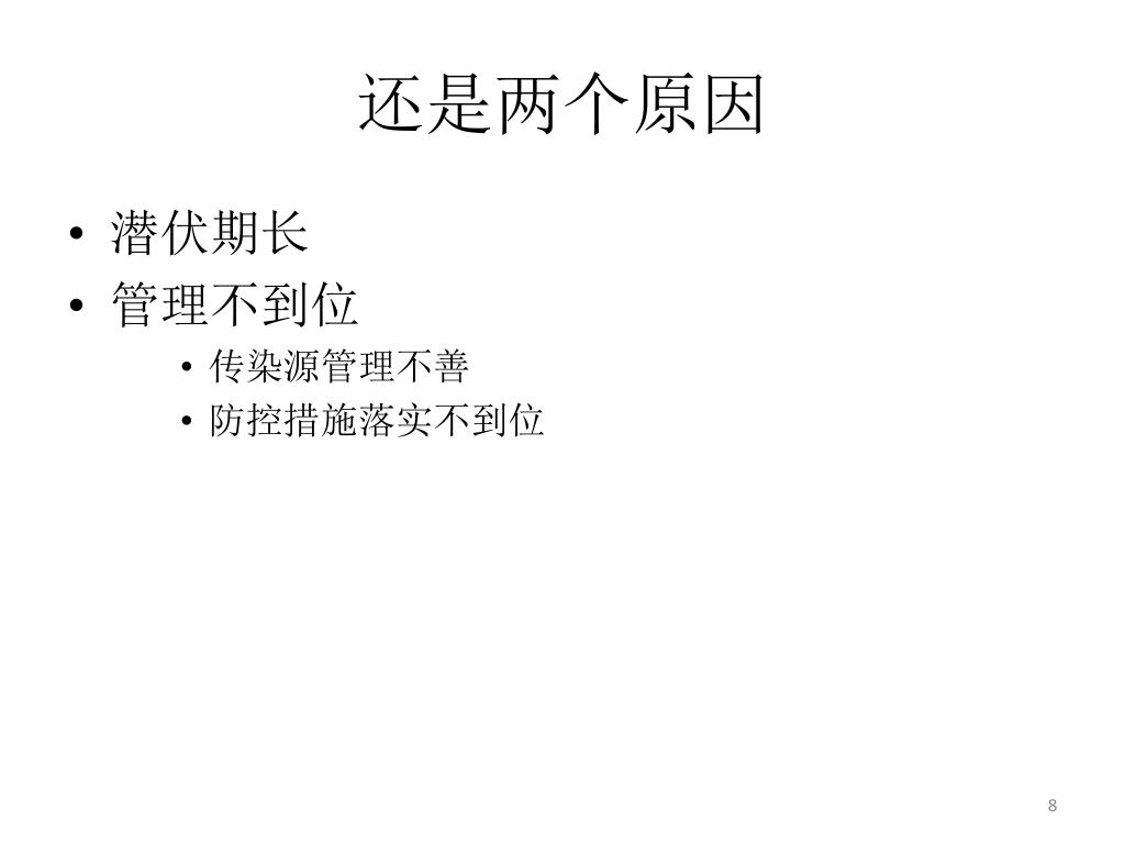 还是两个原因 • 潜伏期长 • 管理不到位 • 传染源管理不善 • 防控措施落实不到位