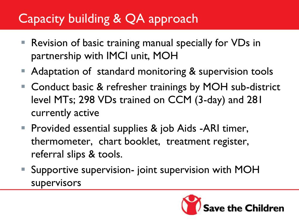 Capacity building & QA approach • Revision of basic training manual specially for VDs in partnership with IMCI unit, MOH • Adaptation of standard monitoring & supervision tools • Conduct basic & refresher trainings by MOH sub-district level MTs; 298 VDs trained on CCM (3-day) and 281 currently active • Provided essential supplies & job Aids -ARI timer, thermometer, chart booklet, treatment register, referral slips & tools. • Supportive supervision- joint supervision with MOH supervisors