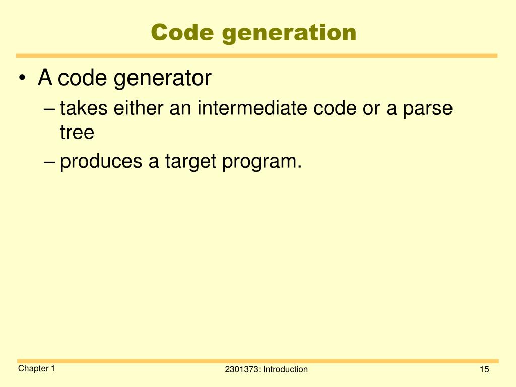 Code generation • A code generator • takes either an intermediate code or a parse tree • produces a target program. 2301373: Introduction