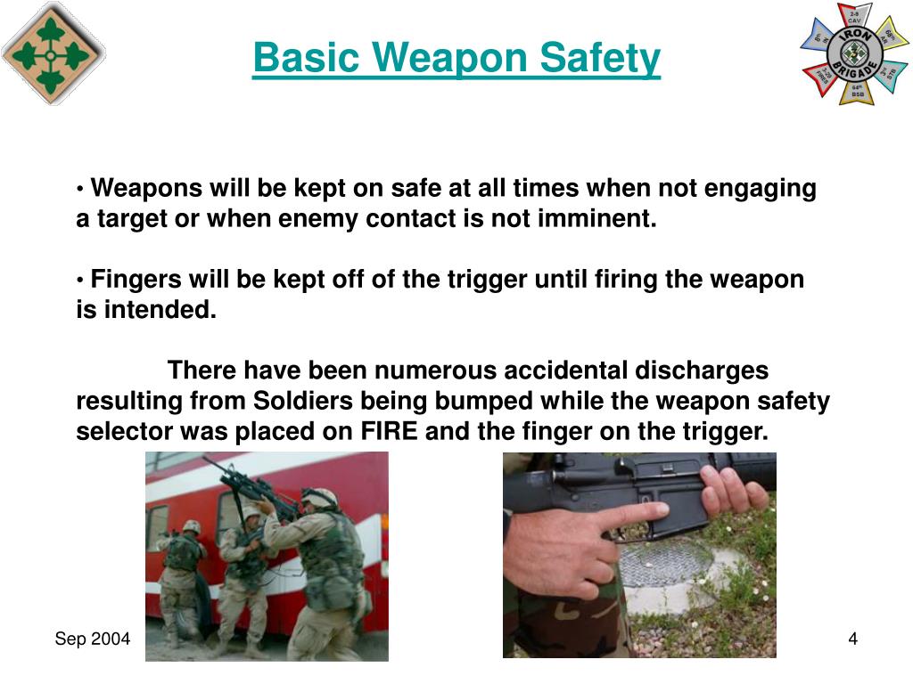 Basic Weapon Safety • Weapons will be kept on safe at all times when not engaging • a target or when enemy contact is not imminent. • Fingers will be kept off of the trigger until firing the weapon • is intended. • There have been numerous accidental discharges • resulting from Soldiers being bumped while the weapon safety • selector was placed on FIRE and the finger on the trigger.
