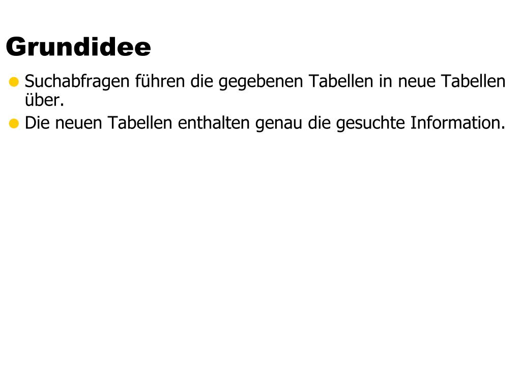 Grundidee • Suchabfragen führen die gegebenen Tabellen in neue Tabellen über. • Die neuen Tabellen enthalten genau die gesuchte Information.