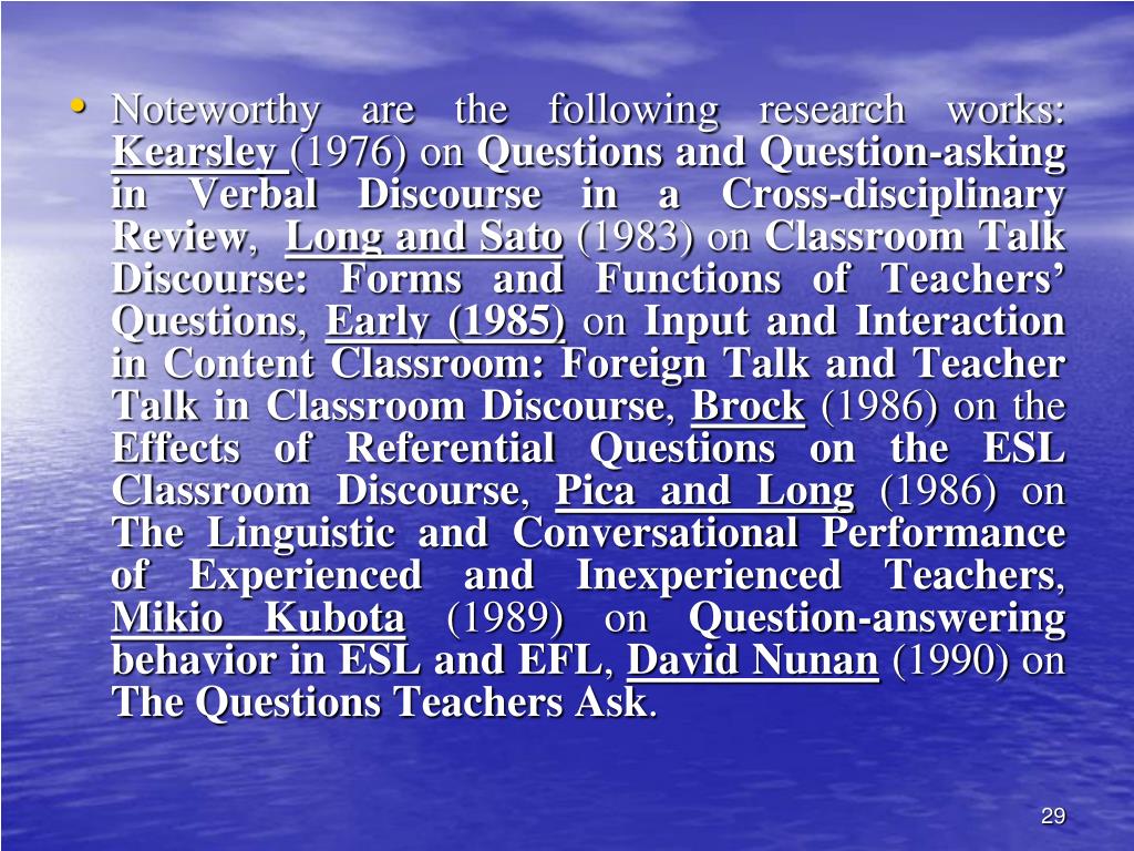 Noteworthy are the following research works: Kearsley (1976) on Questions and Question-asking in Verbal Discourse in a Cross-disciplinary Review, Long and Sato (1983) on Classroom Talk Discourse: Forms and Functions of Teachers’ Questions, Early (1985) on Input and Interaction in Content Classroom: Foreign Talk and Teacher Talk in Classroom Discourse, Brock (1986) on the Effects of Referential Questions on the ESL Classroom Discourse, Pica and Long (1986) on The Linguistic and Conversational Performance of Experienced and Inexperienced Teachers, Mikio Kubota (1989) on Question-answering behavior in ESL and EFL, David Nunan (1990) on The Questions Teachers Ask.