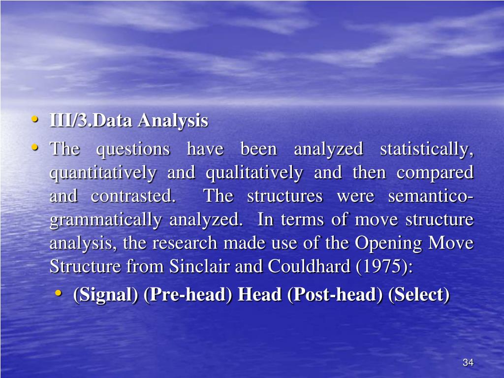 III/3.Data Analysis • The questions have been analyzed statistically, quantitatively and qualitatively and then compared and contrasted. The structures were semantico-grammatically analyzed. In terms of move structure analysis, the research made use of the Opening Move Structure from Sinclair and Couldhard (1975): • (Signal) (Pre-head) Head (Post-head) (Select)