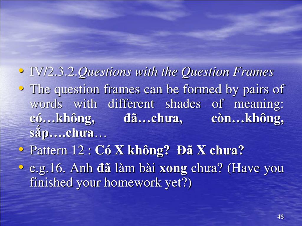 IV/2.3.2.Questions with the Question Frames • The question frames can be formed by pairs of words with different shades of meaning: có…không, đã…chưa, còn…không, sắp….chưa… • Pattern 12 : Có X không? Đã X chưa? • e.g.16. Anh đã làm bài xong chưa? (Have you finished your homework yet?)