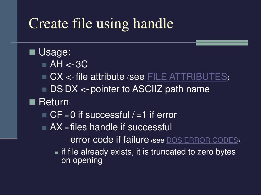 Create file using handle • Usage: • AH <-3C • CX <-file attribute (see FILE ATTRIBUTES) • DS:DX <-pointer to ASCIIZ path name • Return: • CF = 0 if successful /=1 if error • AX = files handle if successful = error code if failure(see DOS ERROR CODES) • if file already exists, it is truncated to zero bytes on opening