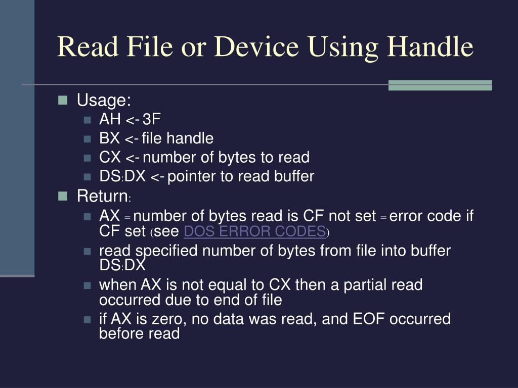 Read File or Device Using Handle • Usage: • AH <-3F • BX <-file handle • CX <-number of bytes to read • DS:DX <-pointer to read buffer • Return: • AX = number of bytes read is CF not set = error code if CF set (see DOS ERROR CODES) • read specified number of bytes from file into buffer DS:DX • when AX is not equal to CX then a partial read occurred due to end of file • if AX is zero, no data was read, and EOF occurred before read