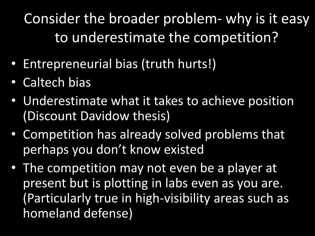 Entrepreneurial bias (truth hurts!) Caltech bias Underestimate what it takes to achieve position (Discount Davidow thesis) Competition has already solved problems that perhaps you don’t know existed The competition may not even be a player at present but is plotting in labs even as you are. (Particularly true in high-visibility areas such as homeland defense) Consider the broader problem- why is it easy to underestimate the competition?
