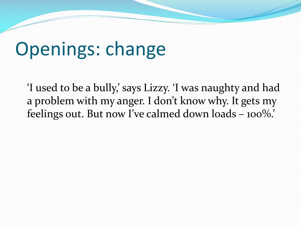 Openings: change ‘I used to be a bully,’ says Lizzy. ‘I was naughty and had a problem with my anger. I don’t know why. It gets my feelings out. But now I’ve calmed down loads – 100%.’