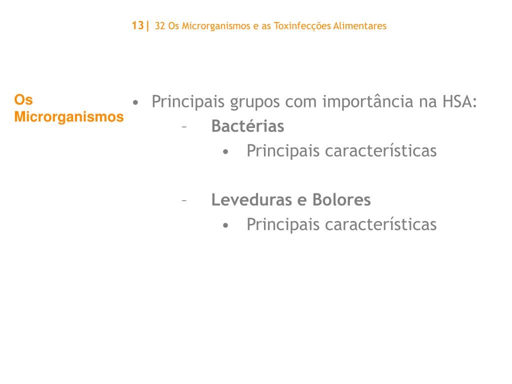 13|32 Os Microrganismos e as Toxinfecções Alimentares Os Microrganismos • Principais grupos com importância na HSA: • Bactérias • Principais características • Leveduras e Bolores • Principais características