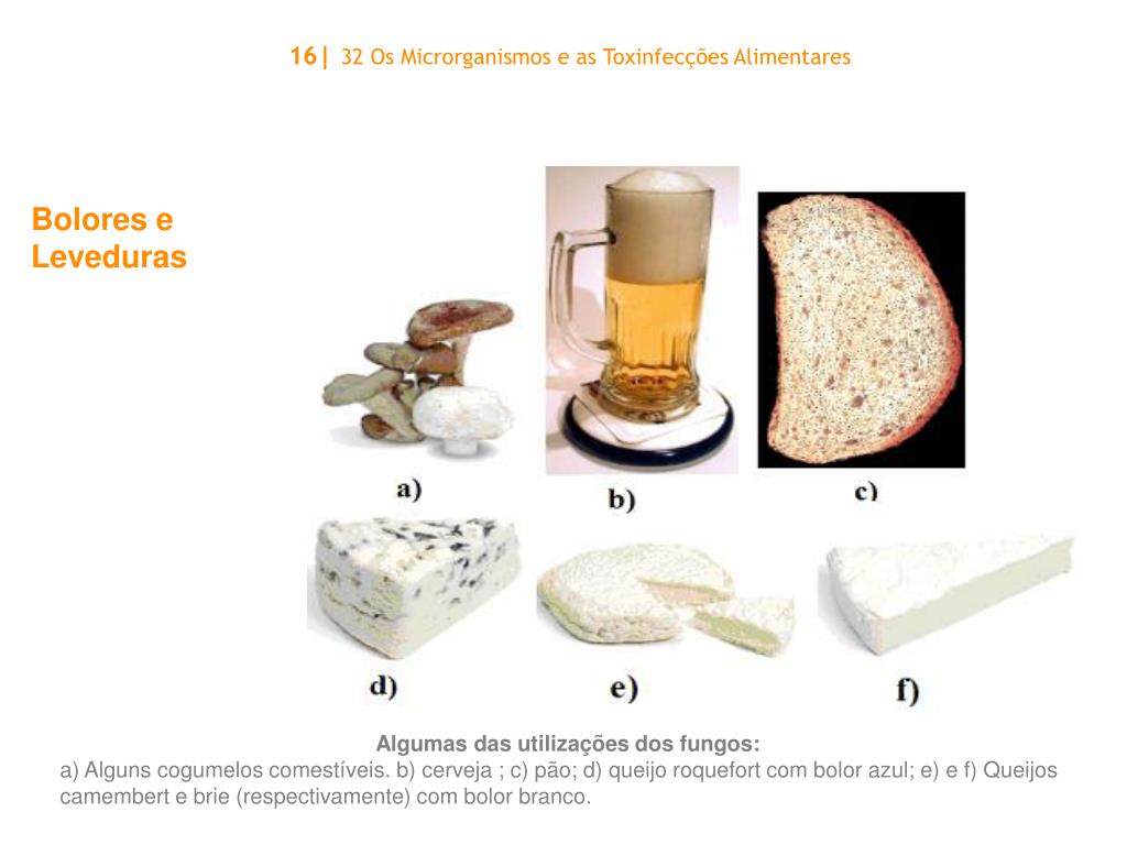 16|32 Os Microrganismos e as Toxinfecções Alimentares Bolores e Leveduras Algumas das utilizações dos fungos: a) Alguns cogumelos comestíveis. b) cerveja ; c) pão; d) queijo roquefort com bolor azul; e) e f) Queijos camembert e brie (respectivamente) com bolor branco.