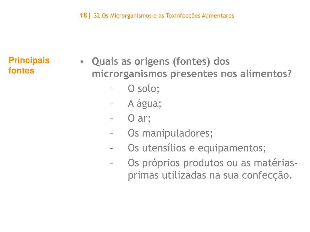 18|32 Os Microrganismos e as Toxinfecções Alimentares Principais fontes • Quais as origens (fontes) dos microrganismos presentes nos alimentos? • O solo; • A água; • O ar; • Os manipuladores; • Os utensílios e equipamentos; • Os próprios produtos ou as matérias-primas utilizadas na sua confecção.