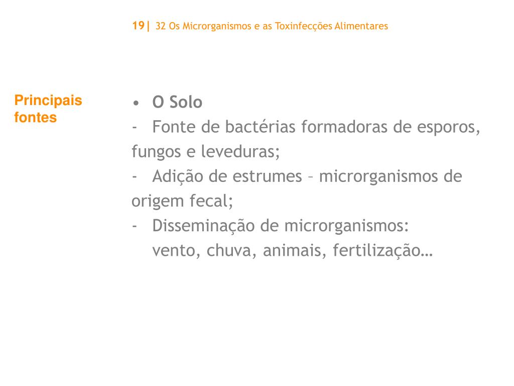 19|32 Os Microrganismos e as Toxinfecções Alimentares Principais fontes • O Solo • Fonte de bactérias formadoras de esporos, • fungos e leveduras; • Adição de estrumes – microrganismos de • origem fecal; • Disseminação de microrganismos: • vento, chuva, animais, fertilização…