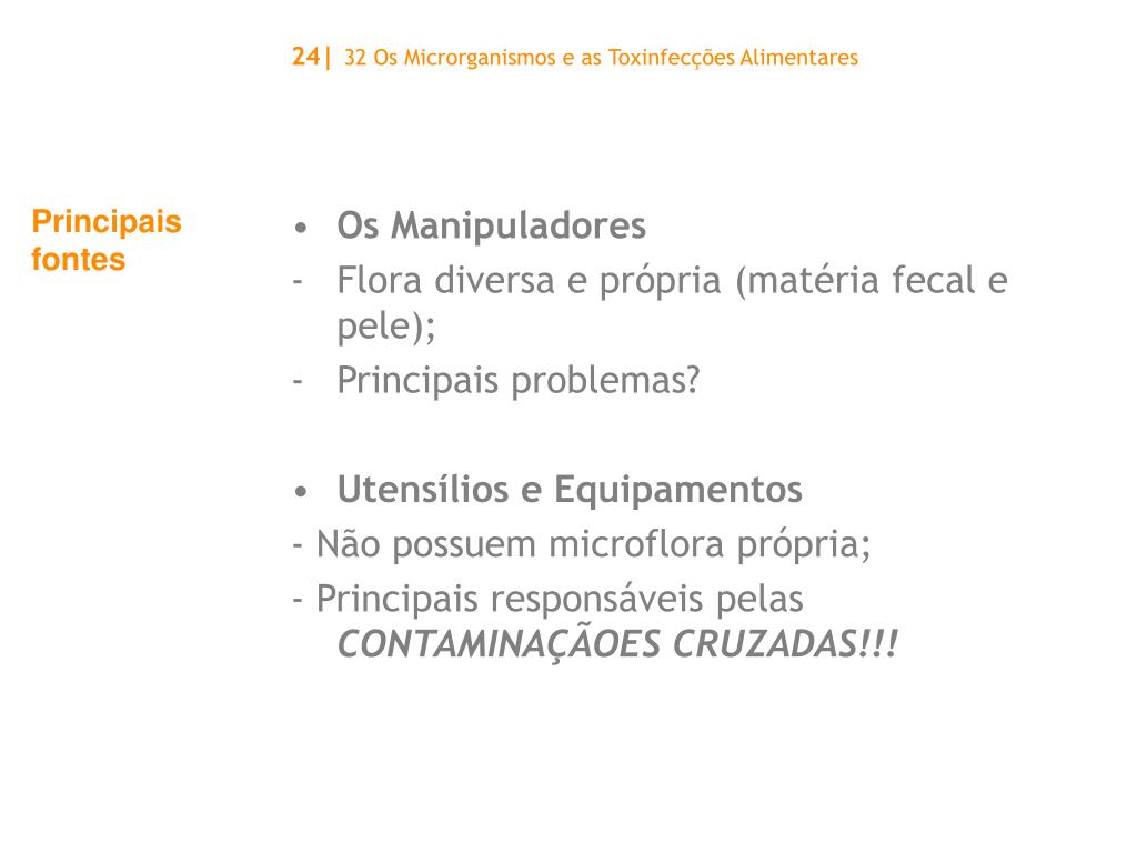 24|32 Os Microrganismos e as Toxinfecções Alimentares Principais fontes • Os Manipuladores • Flora diversa e própria (matéria fecal e pele); • Principais problemas? • Utensílios e Equipamentos • -Não possuem microflora própria; • - Principais responsáveis pelasCONTAMINAÇÃOES CRUZADAS!!!