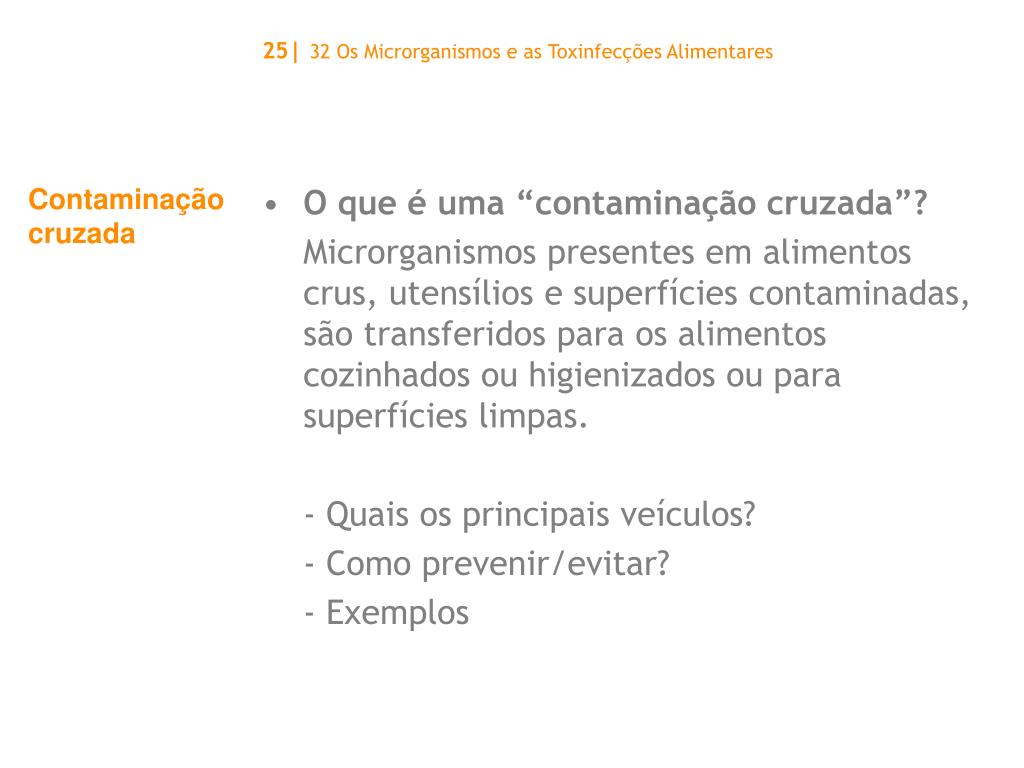 25|32 Os Microrganismos e as Toxinfecções Alimentares Contaminação cruzada • O que é uma “contaminação cruzada”? • Microrganismos presentes em alimentos crus, utensílios e superfícies contaminadas, são transferidos para os alimentos cozinhados ou higienizados ou para superfícies limpas. • - Quais os principais veículos? • - Como prevenir/evitar? • - Exemplos