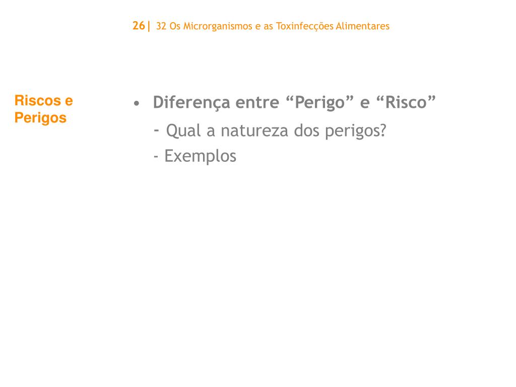 26|32 Os Microrganismos e as Toxinfecções Alimentares Riscos e Perigos • Diferença entre “Perigo” e “Risco” • - Qual a natureza dos perigos? • - Exemplos