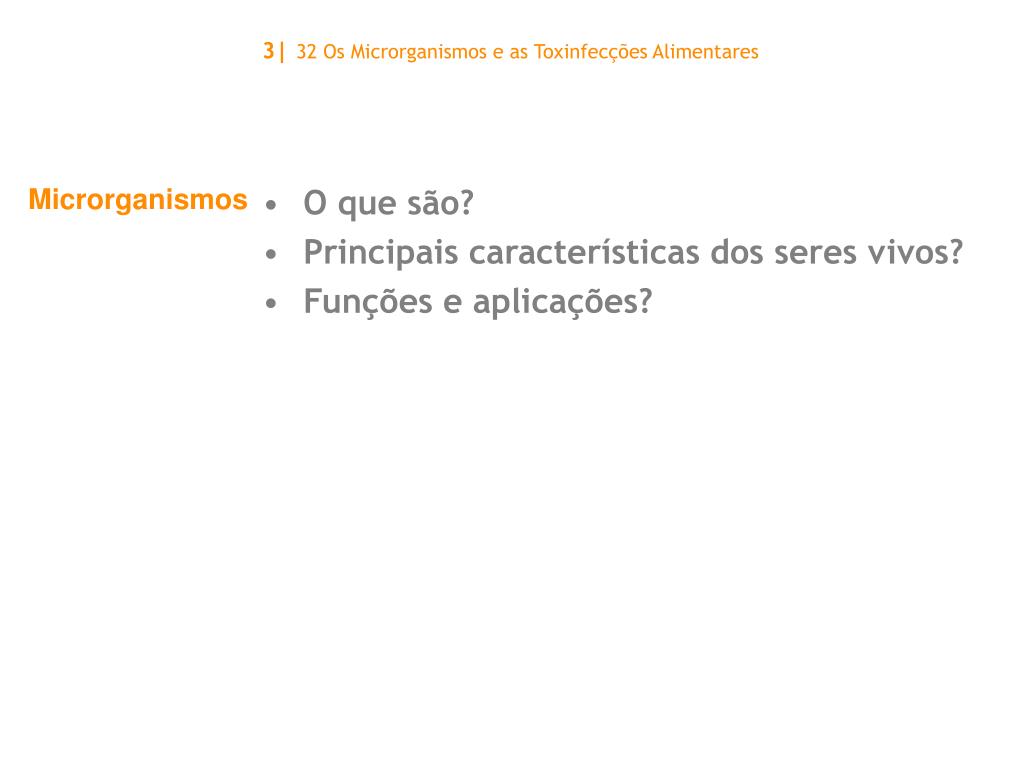 3|32 Os Microrganismos e as Toxinfecções Alimentares Microrganismos • O que são? • Principais características dos seres vivos? • Funções e aplicações?